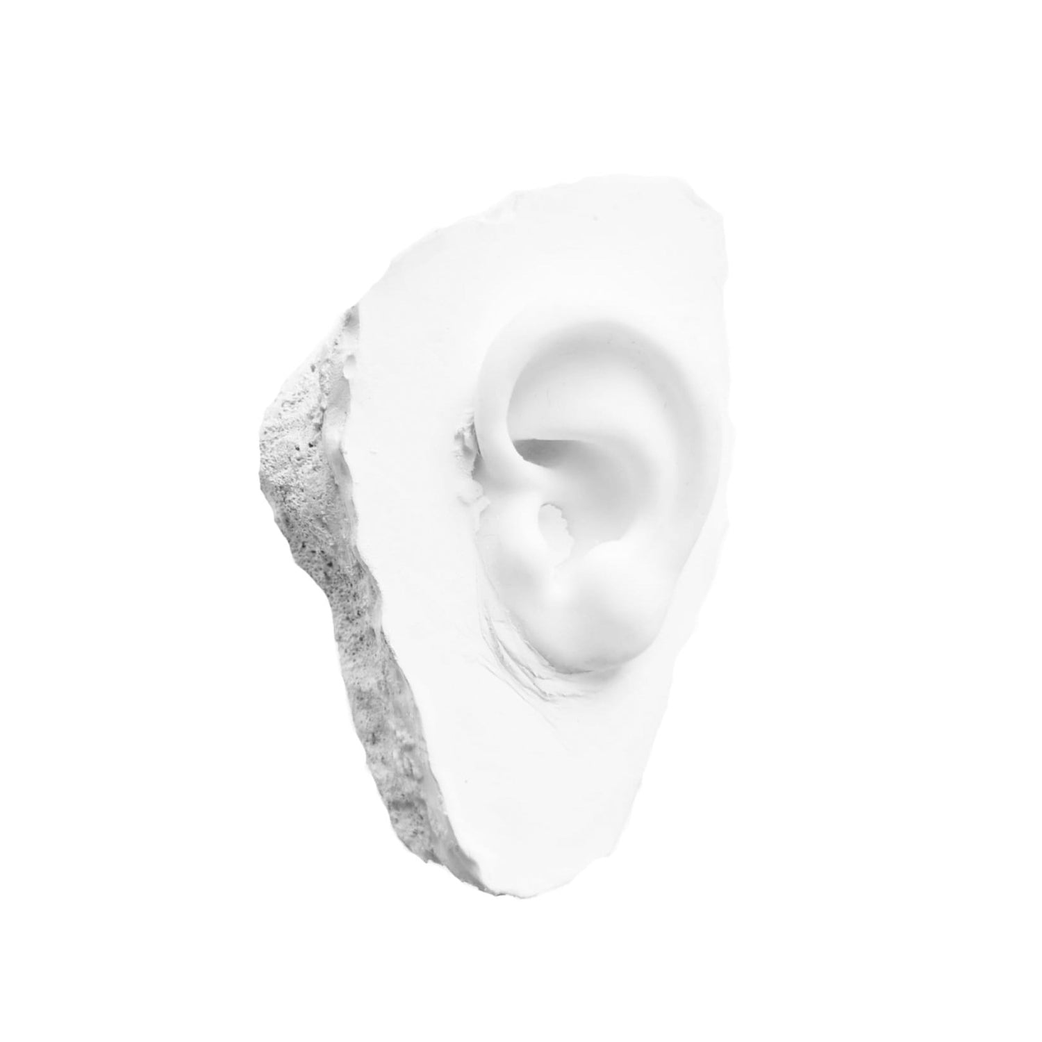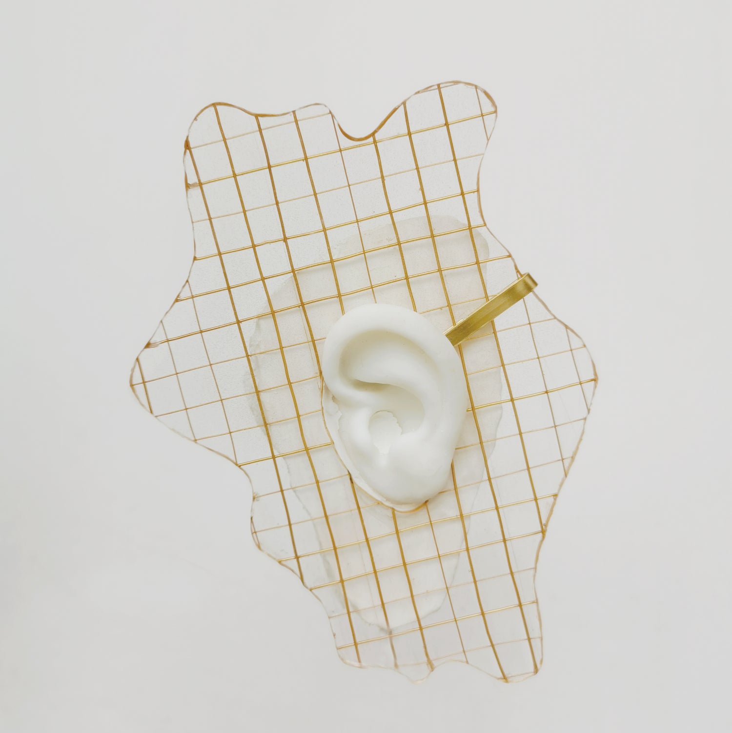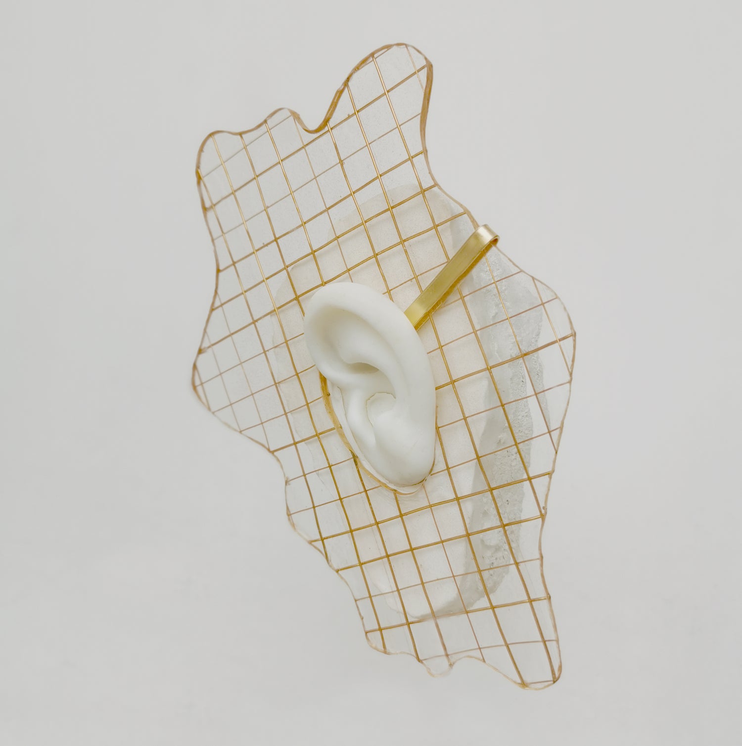 1+3- the earpiece, gold threads trapped in clear resin / 2- Ear sculpture made by Akebehi Kpolo for Ohiri Studio, plaster and resin