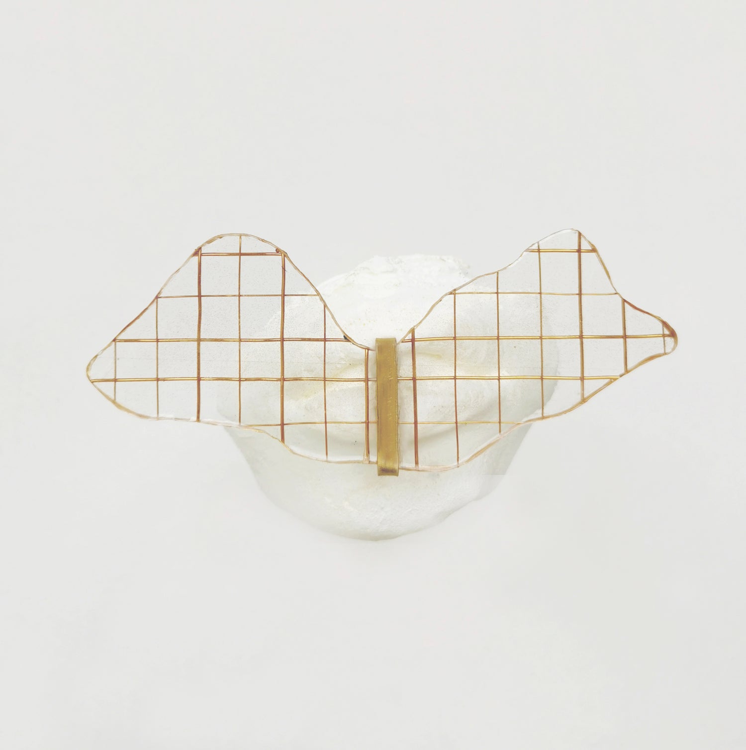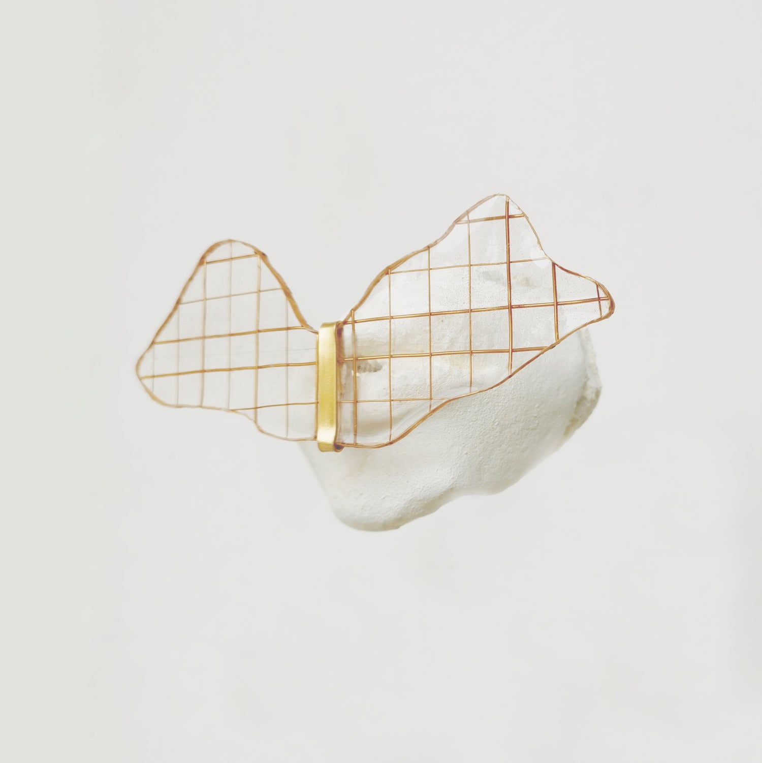Gold threads trapped in clear resin. The meaning behind this technique is that sometimes people have to break down barriers if they want to see the truth.
